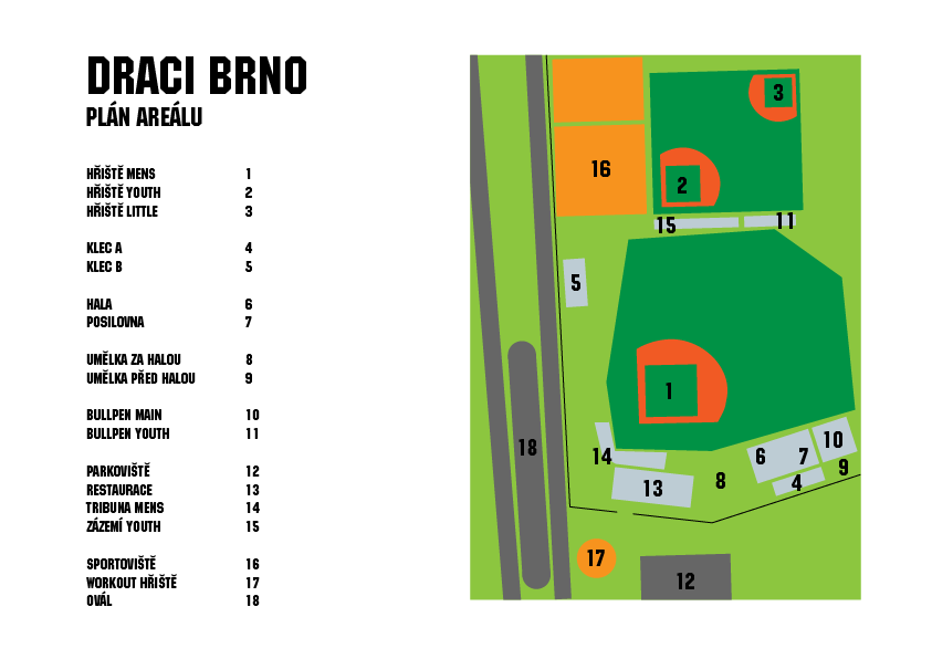 Tréninky do listopadu budou probíhat každý pátek od 16:30 přímo v areálu Draků Brno na malém hřišti (číslo 2 na mapce)